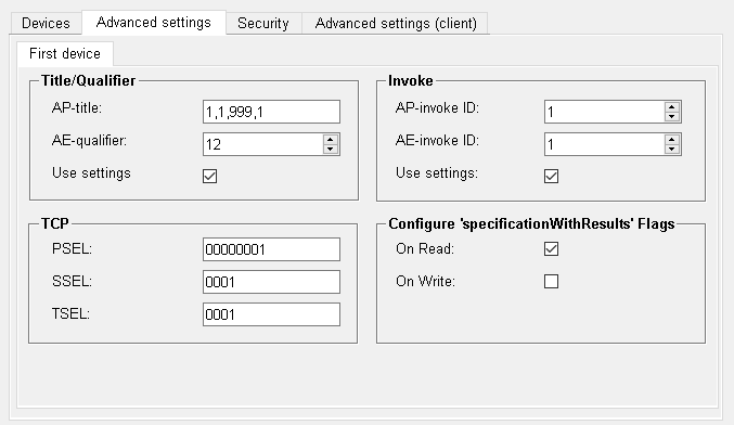 This panel allows to configure advanced server parameters. By default, only the tab for the first device is shown, the tab for the second device is only displayed if the option "redundant device" is enabled.