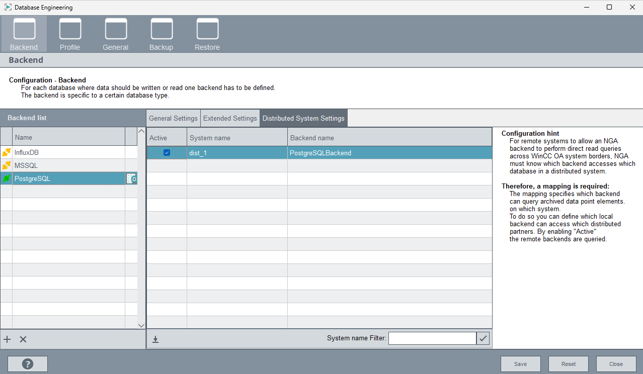 When you select a local backend from the Backend list, you can activate the remote backends associated with this local system, on the Distributed System Settings tab by clicking in the Active column. By enabling Active the remote backends are queried. There can be multiple systems and one backend can have multiple partners, but only one per system (only one backend per system).