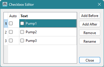 The check box Editor is used to manage the individual check box entries.