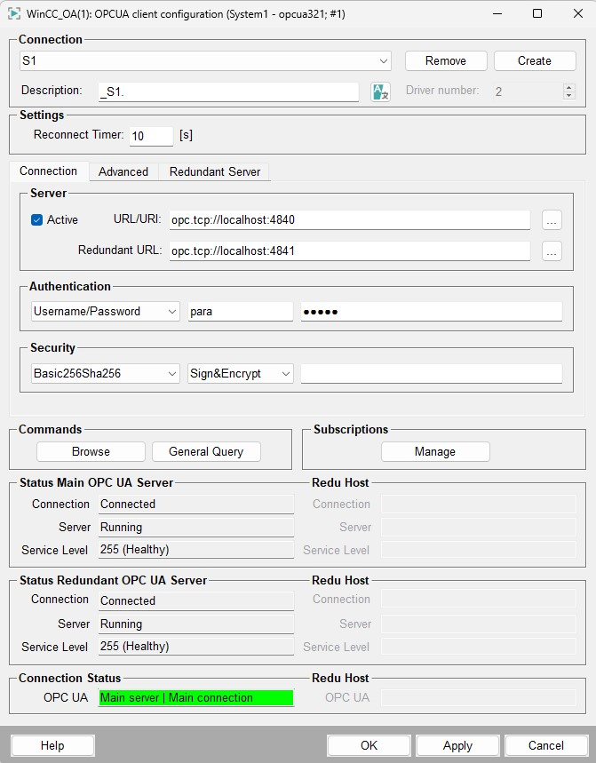 The connection datapoint _<connection_name> with the set parameters is created at type _OPCUAServer (in a redundant project a datapoint with the name "_<connection name>_2" is created automatically for the redundant WinCC OA server) by clicking on Apply. If you click on the OK button the connection datapoint is created with the set parameters and the configuration panel is closed. To close the configuration panel without creating the connection datapoint (if not already done before) click on Cancel.