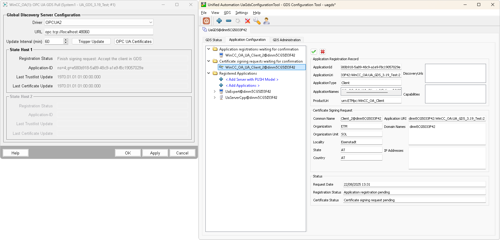 Using the Trigger Update button, the GDS interaction can be triggered. The WinCC OA OPC UA Client then has to be accepted in the GDS by selecting the client application and pressing the green OK symbol.