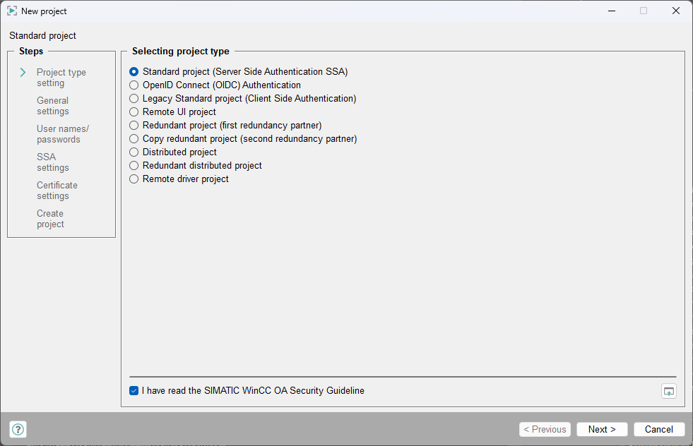 - OpenID Connect (OIDC) Project: A project using OpenID Connector for the user authentication within the user interfaces and SSA for other manager authentication. Creating a project that uses OIDC requires a WinCC OA JavaScript Manager for Node.js, therefore the setup component Environment for JavaScript must be installed as part of WinCC OA.