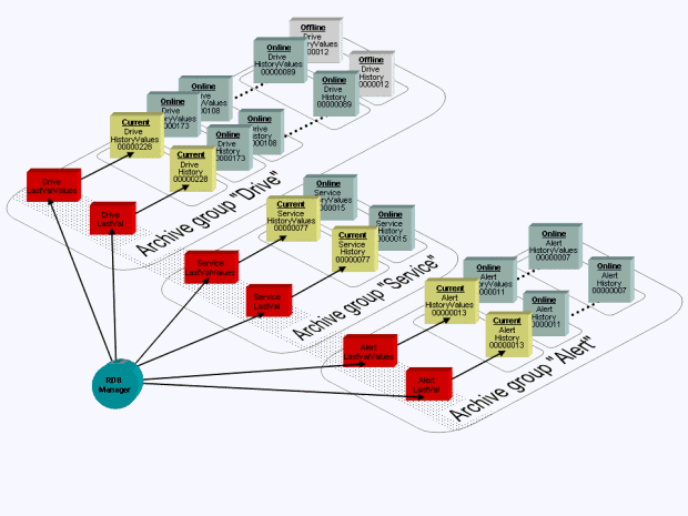 All related tables ("current", "online", "offline") form an archive group. In this case, the two input tables (one for the "normal" values and one for the array data types) and the child tables responsible for actual archiving all belong together. The smallest possible content of an archive group is thus four tables, 2 input tables and 2 child tables with "current" status. However, an archive group can of course also contain an additional and variable number of "online" and "offline" tables.