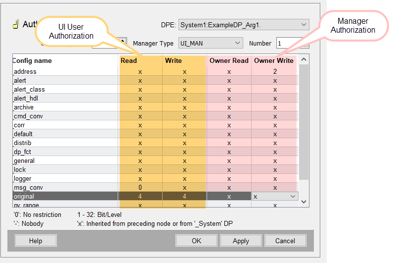 Read and write permission for a specific datapoint config can, however, be specified by using the _auth config. This means that if a user does not have a permission to write datapoint values in a WinCC OA system, the user could, however, write the value of a specific datapoint by using the _auth config and setting an authorization for the _original config (see figure below). Therefore, the _auth config specifies an additional authorization level for datapoint configs.