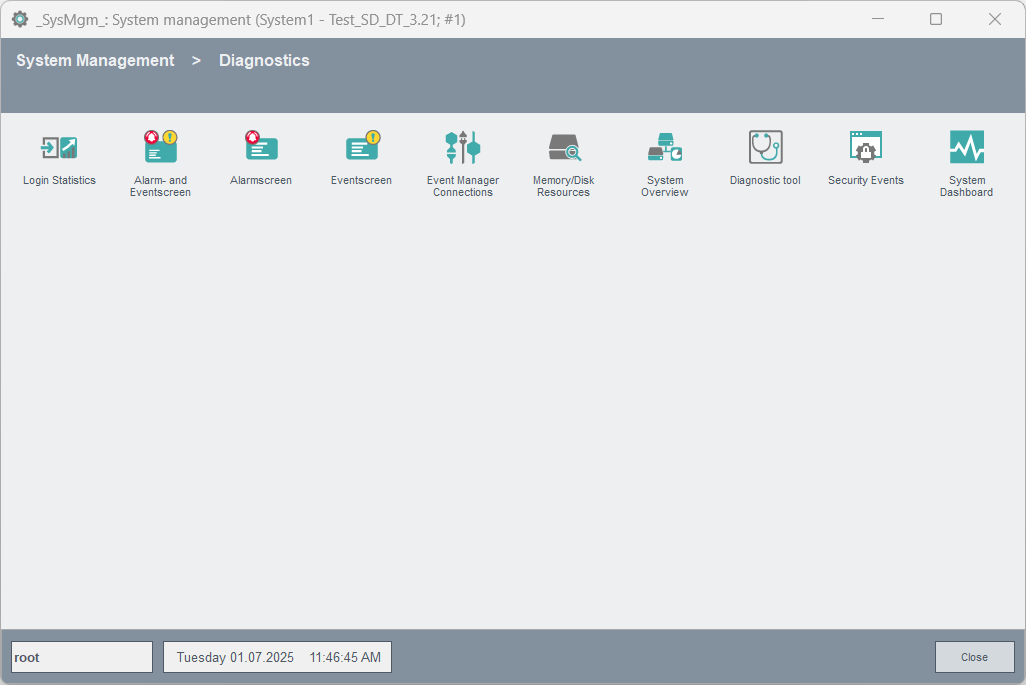 The system management is divided into twelve topics (see figures below). The buttons then lead to the following, specific panels that are used for central configurations in WinCC OA.
