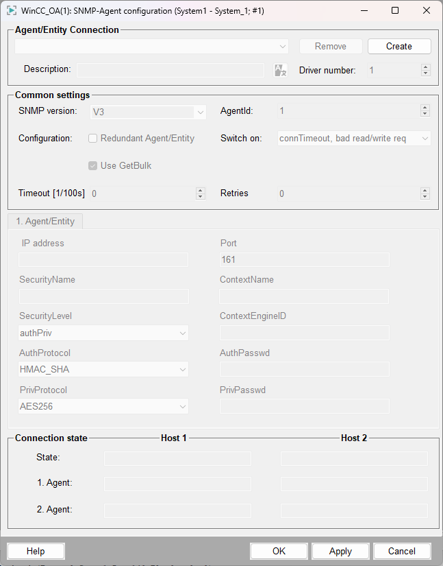 In order to use SNMPv3 there are some additional optional config entries. Furthermore, the SNMP configuration panel as well as the address config for the SNMP driver were modified. You can now also configure SNMPv3 entities and set the entity type in the address panel. The config entries and the configuration and address panels are described in the following section.