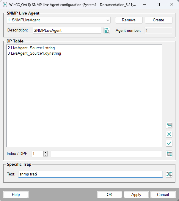 The DP Table shows the datapoints that are queried via SNMP. The datapoints are chosen via the familiar WinCC OA buttons and are added to the table via the Apply button. The datapoints contain an index, which is used to communicate with the datapoints via MIB (e.g. (1.3.6.1.4.1.13828.2.1.20.1.2.idx).The queried datapoint information is presented on other datapoints to which a peripheral address was added.