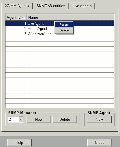 Create a SNMP manager via the New button. Create new SNMP agents "LiveAgent", "PmonAgent" and "WindowsAgent" for the SNMP manager.