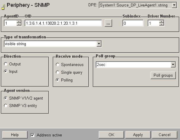 Add a SNMP address config to the string and dynString datapoint elements of the datapoint "Data_of_LiveAgent1" (right click on the datapoint and choose the option Periphery address. Choose the SNMP option.