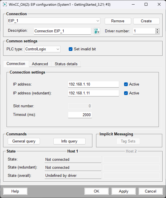 Click on the Ethernet/IP Driver button. Configure the PLC in the following parameterization panel. An internal datapoint of type _EIPConn is created for each PLC (see also Internal datapoints of the Ethernet/IP driver.)