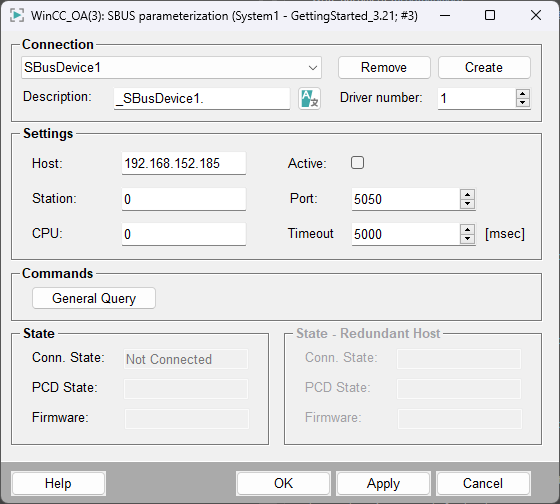 This setting can be changed according to the connection latency between PLC and WinCC OA. A time-out with less than 4000ms is not recommended due to the fact that a correct behavior of the retransmit routine of the S-Bus protocol cannot be granted.