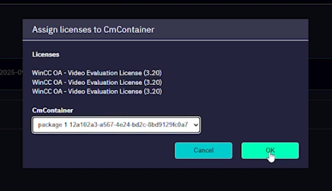 Assigning licenses to a virtual container in the WinCC OA License Portal enables pre-packaging of license options for remote deployment. This process streamlines license preparation for off-site technicians or service personnel, ensuring efficient and organized distribution.