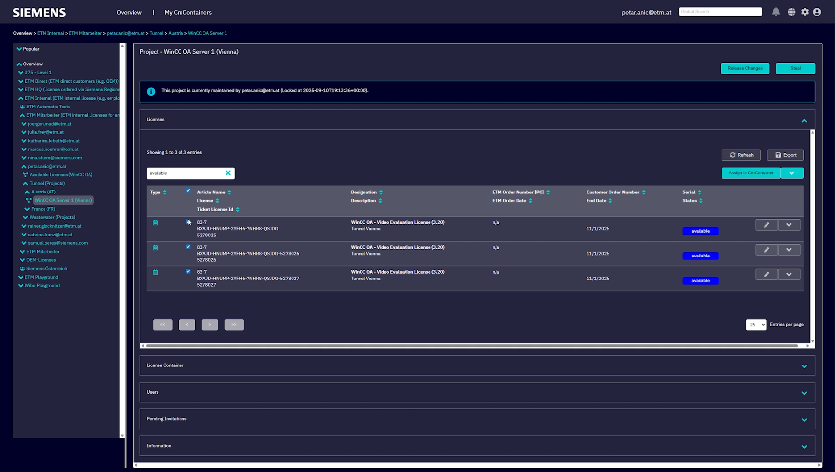Navigate to the license container section to see your new virtual container, complete with a serial number and description. This ensures the intended recipient (e.g., Steve) can identify and deploy their licenses.