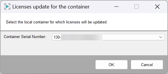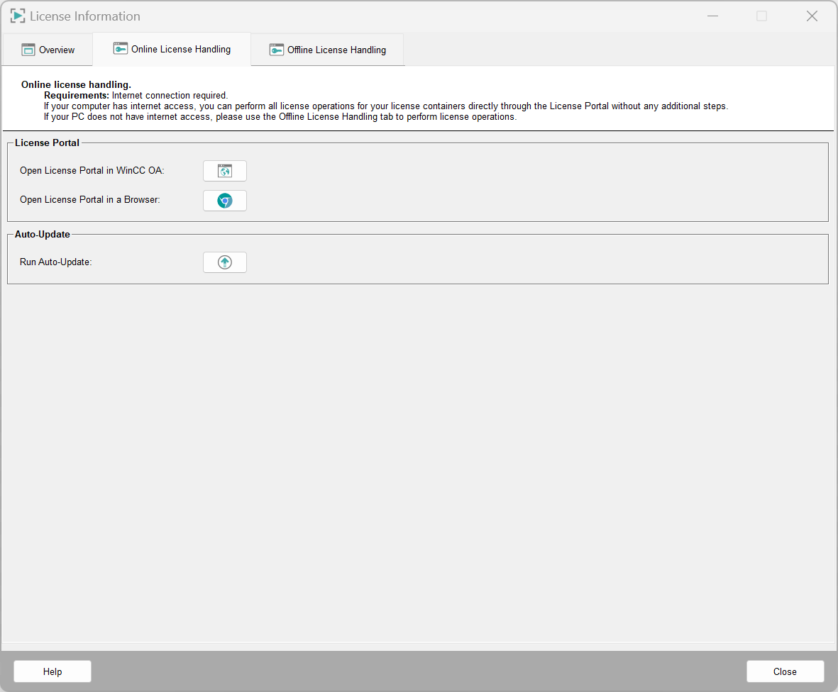 On the Online License Handling tab, you can open the license portal in WinCC OA or in your browser. You can also update your license automatically. This will work if you're on the right computer or if the container is also connected. If not, you'll just need to switch to offline management. When you start the update, a window opens. Select the license container for which you want to update the license.