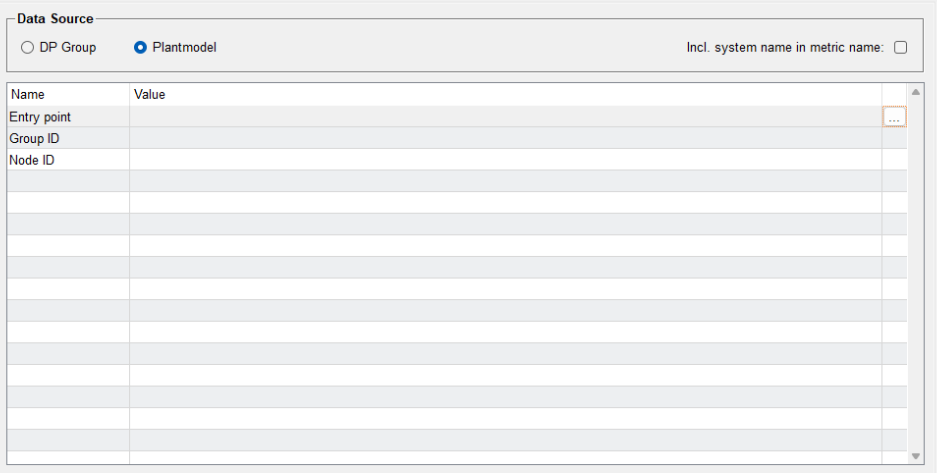 The metric names for the examples above are "ProductionLine:FanSpeed", "ProductionLine/FanSpeed", and "ProductionLine/Temperature". If the option Incl. system name in metric name is enabled, an additional prefix with the system name, such as "System1/", is added.