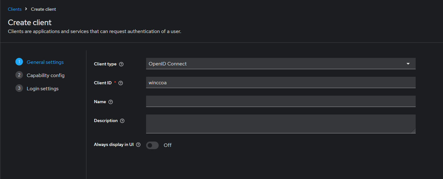 winccoa-client), select OpenID Connect as the protocol, and click Next.