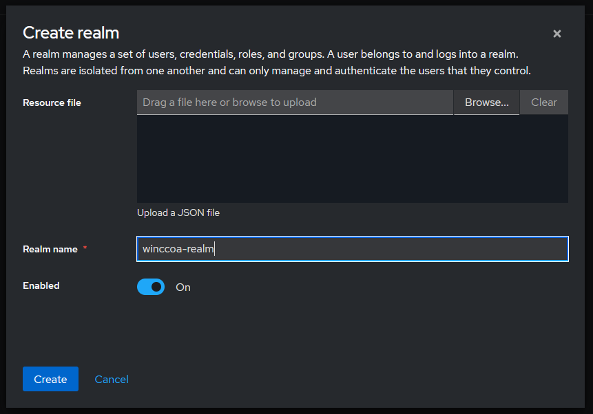 In the admin console, select the realm drop-down and click Create Realm. Enter a name (e.g.,