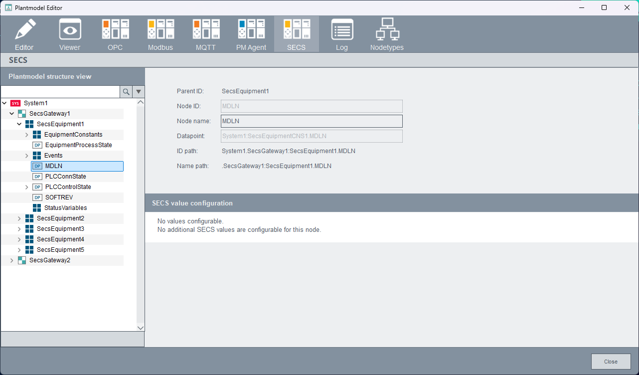For the SECS Gateway, a specific structure in the CNS is required. The structure can be automatically created for existing _SecsGateway and _SecsEquipment DPs in the SECS section of the plant model editor.