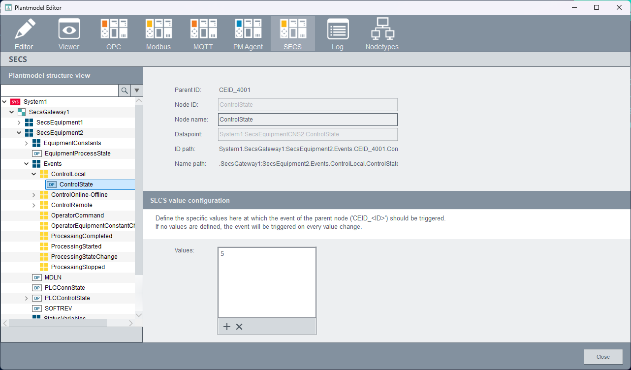 For the PLCConnState node, a SECS value configuration is needed as well. A value can be defined in this node, representing the value of the "Connected" state of a PLC, whose data is used within the equipment connection.
