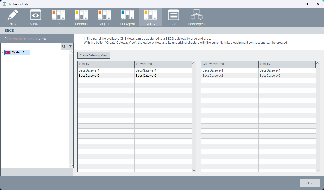 The assignment between view and gateway is done via drag and drop from the left table to the according gateway DP in the right table. Furthermore, a view for a specific and already existing gateway can be created by clicking the Create Gateway View button. After clicking the button, you can select one of the already existing SECS Gateway DPs for which the CNS structure should be created. If equipment connections were already linked in the gateway configuration panel, then the underlying equipment structure for the CNS configuration is also automatically created and only needs to be configured in the plantmodel editor.