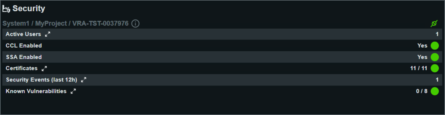 The Security widget provides at-a-glance insight into the project’s active users, security features, certificate health, recent security events, and exposure to known vulnerabilities. Indicators and counters make detection of risks, compliance gaps, or irregularities fast and reliable.