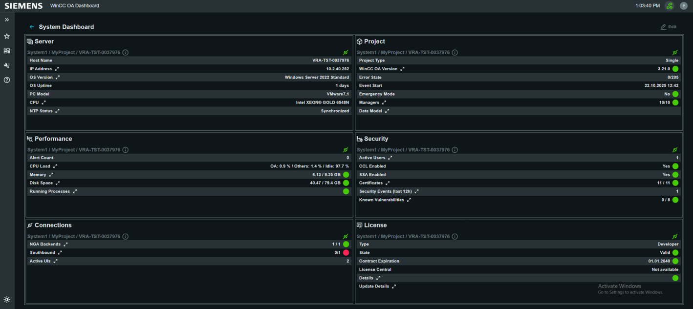 The System Dashboard in WinCC OA provides a central overview of system status, performance metrics, and security aspects. It helps operators and administrators quickly view and assess important information.