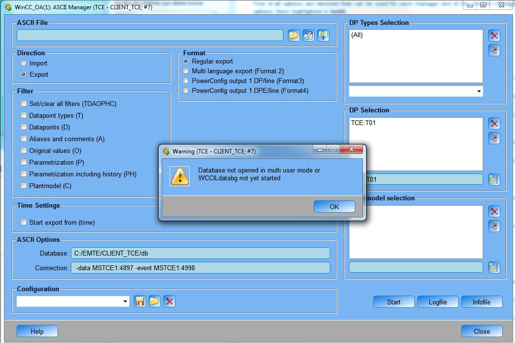 Database not openend in multi user mode or WCCILdatabg not yet started.