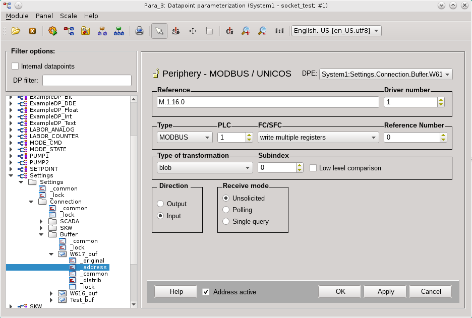 Data which shall be provided by the WinCC OA Modbus TCP server is defined in a CNS view (Plant Model Editor).