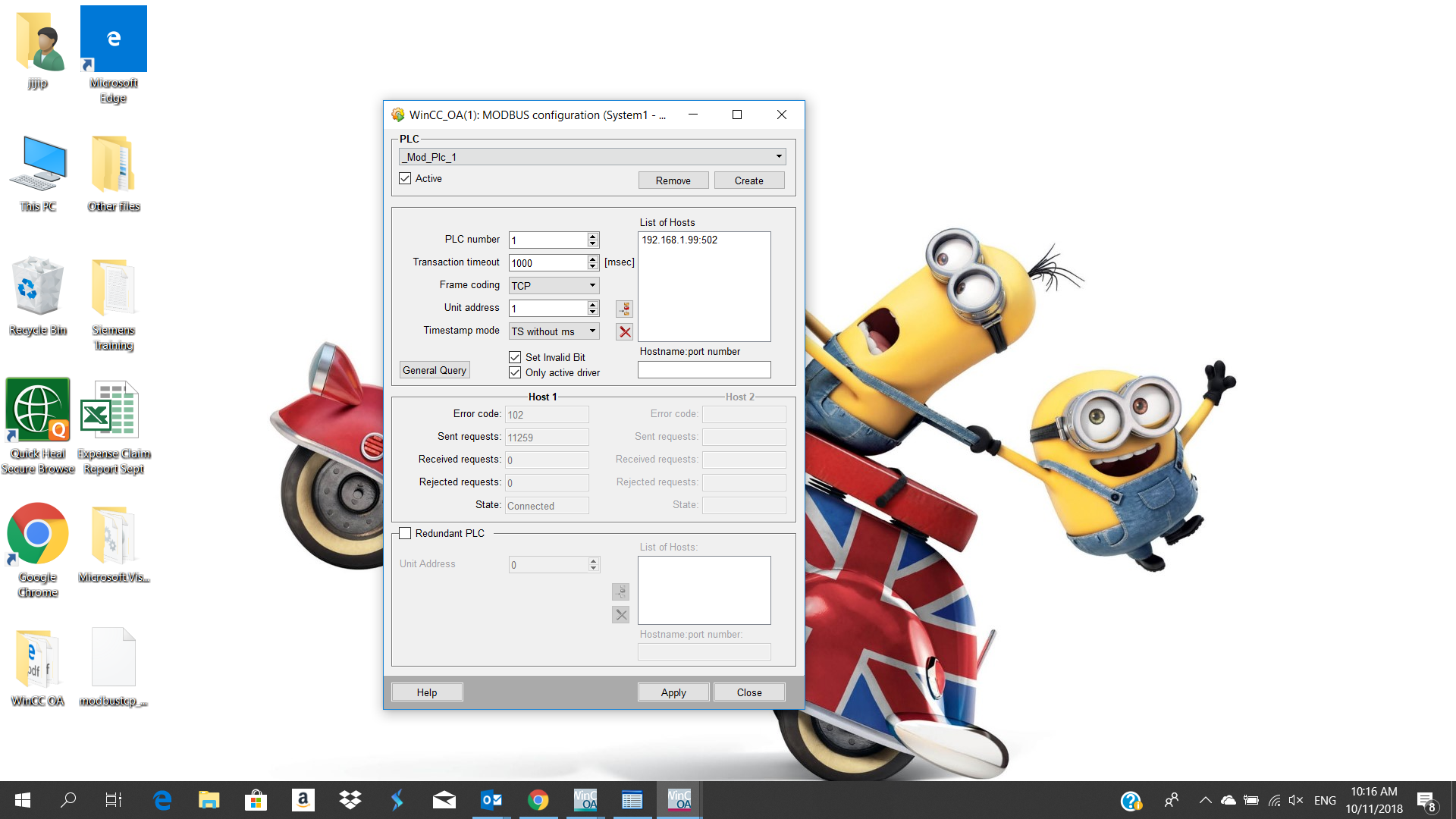 WCCOAmod (1), 2018.10.11 10:10:57.888, PARAM,WARNING, 54, Unexpected state, ModModbusMaster, writeData, No host/unit address defined for PLC number: 0