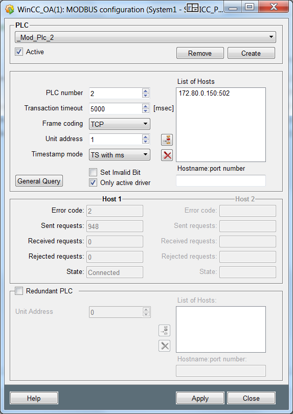 we have a project, where we must establish communication with a Modbus server, at the time of establishing the communication everything works correctly, but the driver constantly reports loss of communication, reconnection and connection.