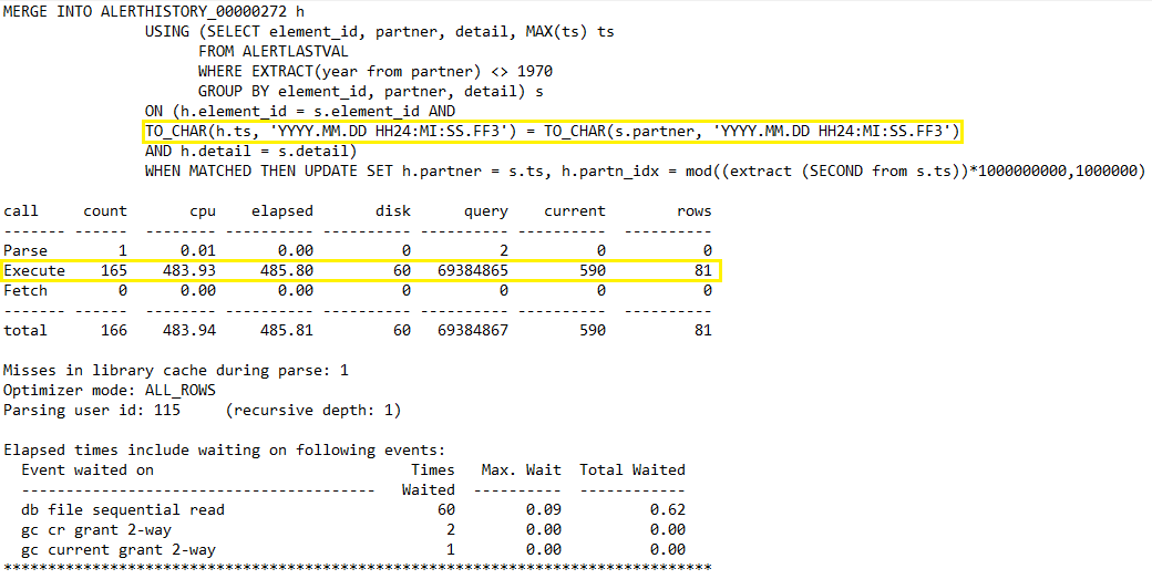 Execution time of one merge statement elapsed about 3 seconds. The reason for slow execution is unindexed condition TO_CHAR(h.ts,'…') = TO_CHAR(s.partner, '…').